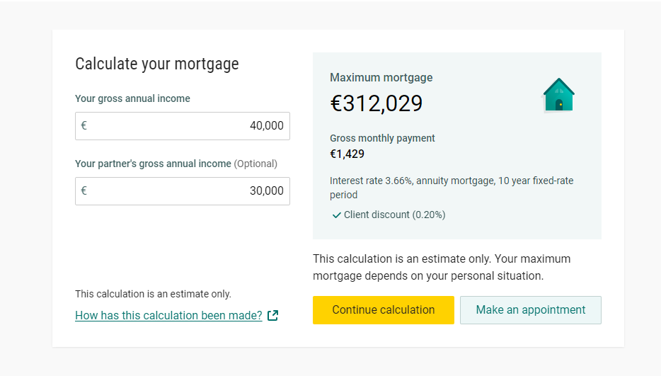 Rabobank’s mortgage calculator provides an estimate of your potential mortgage amount based on your income and financial obligations. Use this tool to better understand your borrowing capacity.