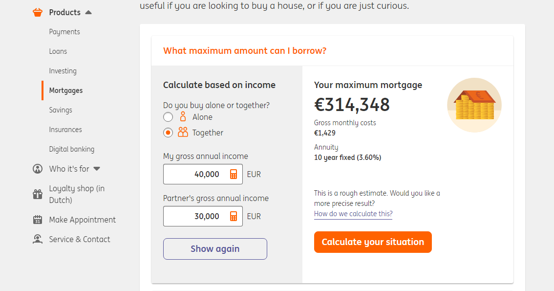 ING’s mortgage calculator helps you determine the maximum amount you can borrow, based on your financial situation. This tool will give you an initial estimate to guide your home-buying journey.