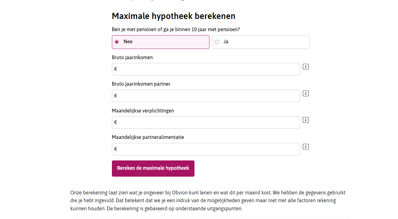 Obvion’s mortgage calculator helps you assess the maximum loan you can qualify for, based on your financial details. Use this tool to gain insight into your potential mortgage possibilities.